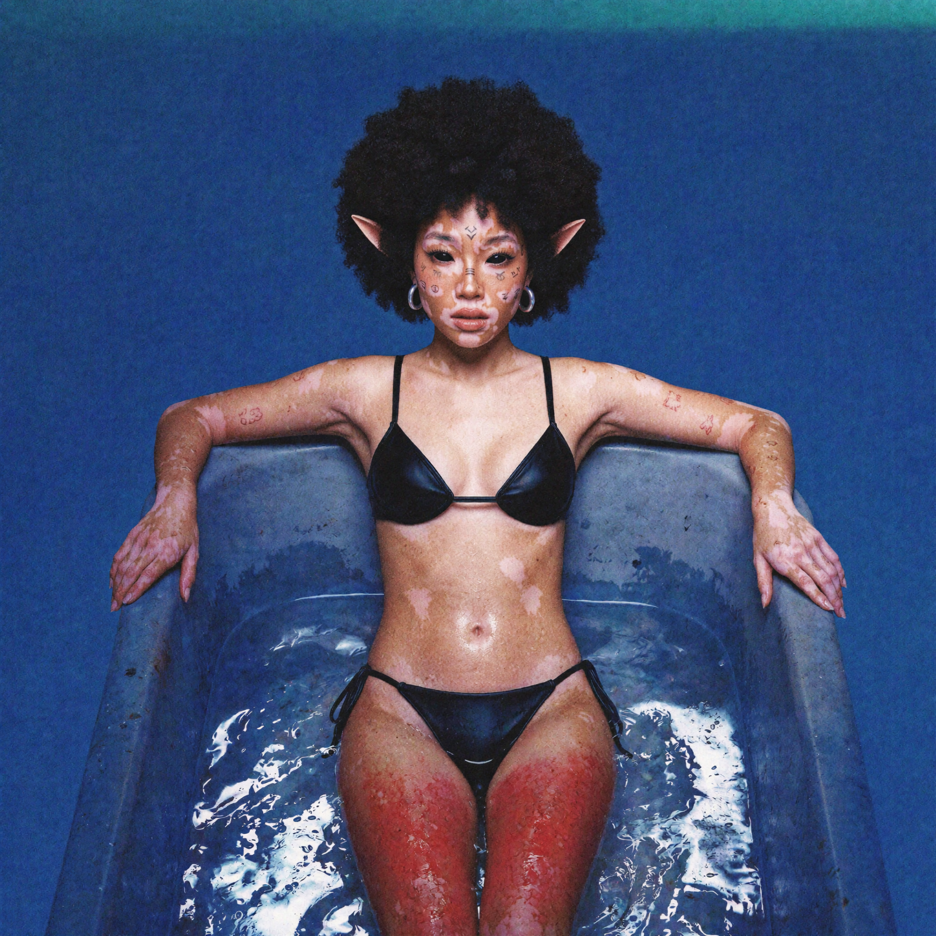 Snímky zachycují Onyx v momentě absolutního klidu. Kontrast mezi chladnou, modrou hloubkou pozadí a hřejivými tóny její kůže vytváří napětí, které je pro Virtua1 model management typické. Onyx zde mění podoby – od výrazného afro vzhledu až po éterickou platinovou blond – čímž dokazuje svou nekonečnou variabilitu.